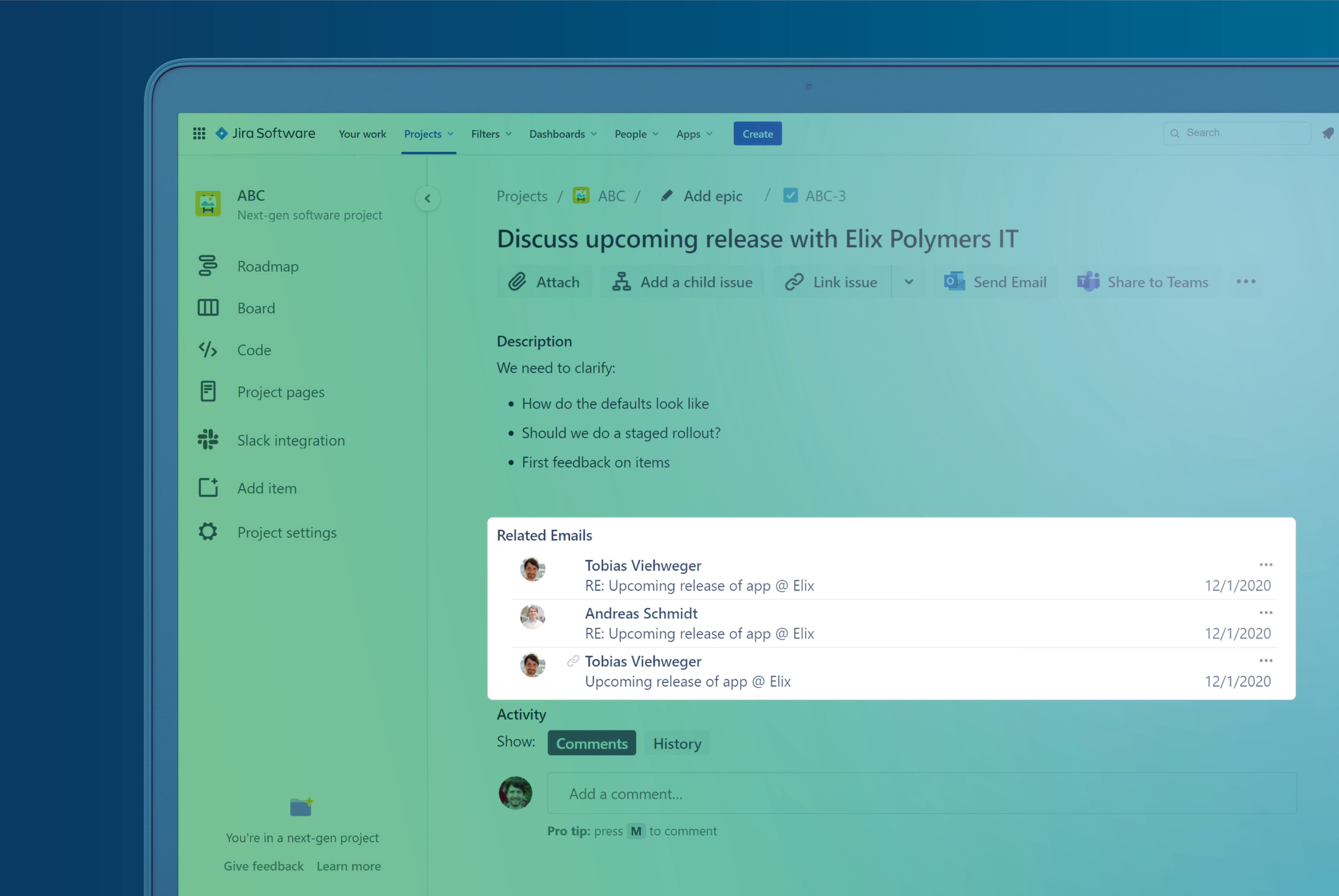 Sending emails from Jira & sharing the email and conversation is a brand new feature for Office 365 & Jira Cloud. It allows you to send emails from Jira and have the whole conversation including replies shared with everyone accessing the Jira issue.