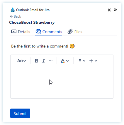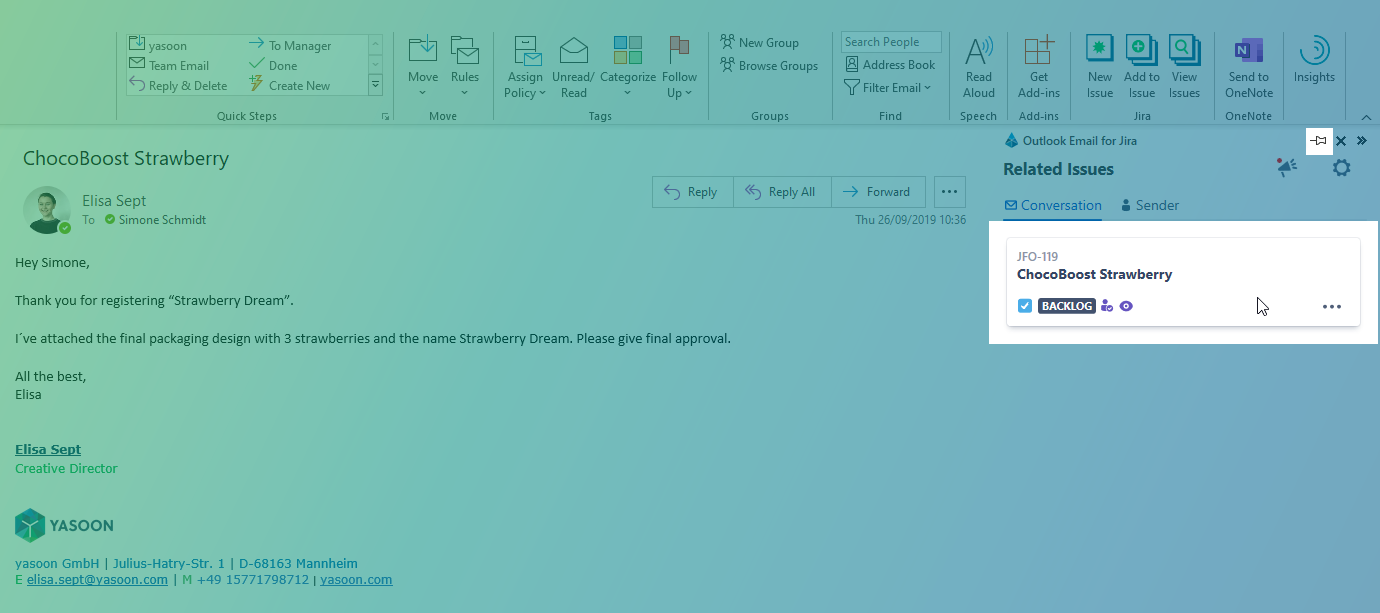 The add-in will not replace the full Jira UI but it gives you the most important actions for your daily work in Outlook.