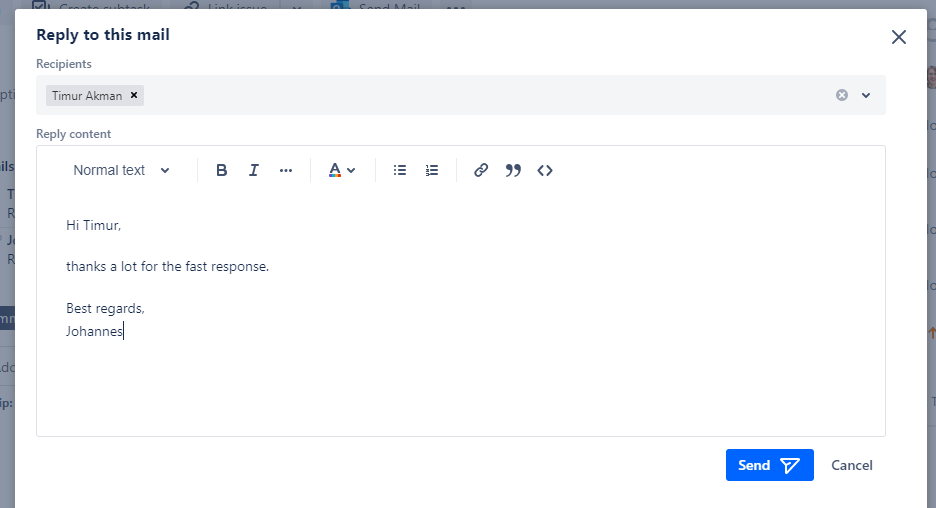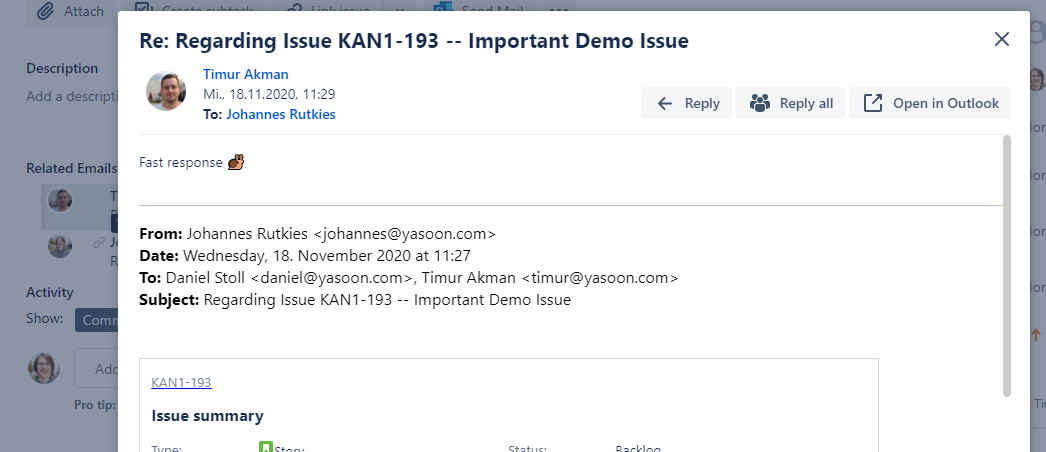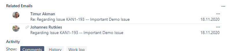 In the “Related Emails” web panel you can see all mails shared by sending the mail directly from Jira (see Send mails from within Jira ) or by creating an issue from Outlook (see Feature: Send & Share emails )