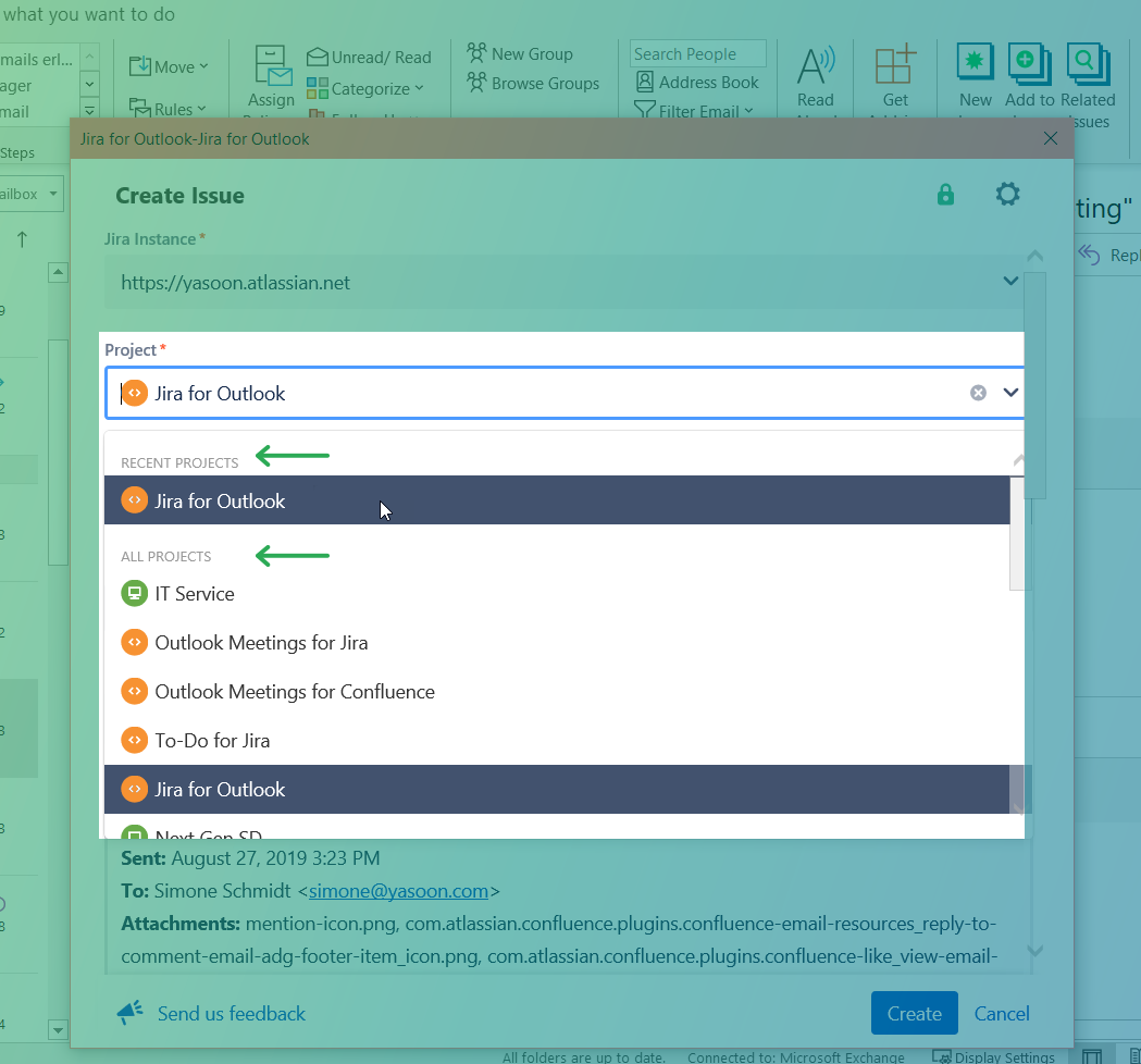 Whenever a certain project name appears in the subject line of an email, the add-in will automatically remember and select it, when you create a new issue in Outlook.