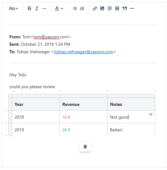 Another big improvement comes with the support for a rich text editor. Previously, if you wanted to take over email formatting like tables, you had a very hard time editing the Jira markup manually. With the new text editor, you’ll be able to edit the content much better before creating the issue - it also supports @-mentions!