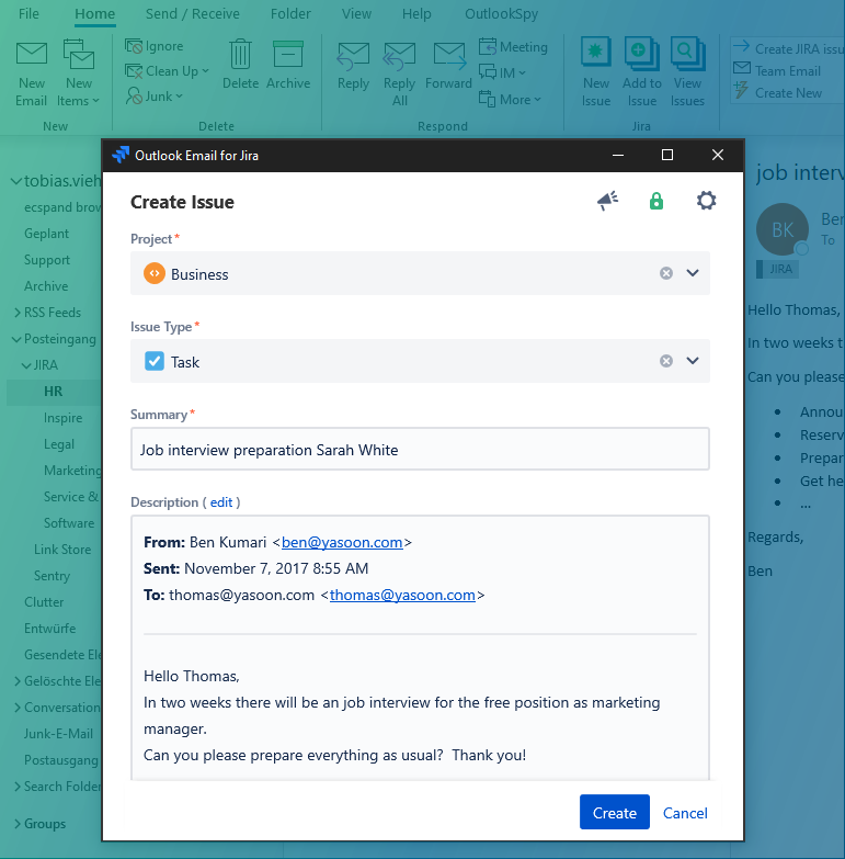 We added the ability to create issues based on appointments & meetings in your Outlook calendar. In addition, if you are using our Outlook Meetings for Jira app to schedule meetings from Jira, you’ll also be able to view the issue on these meetings.