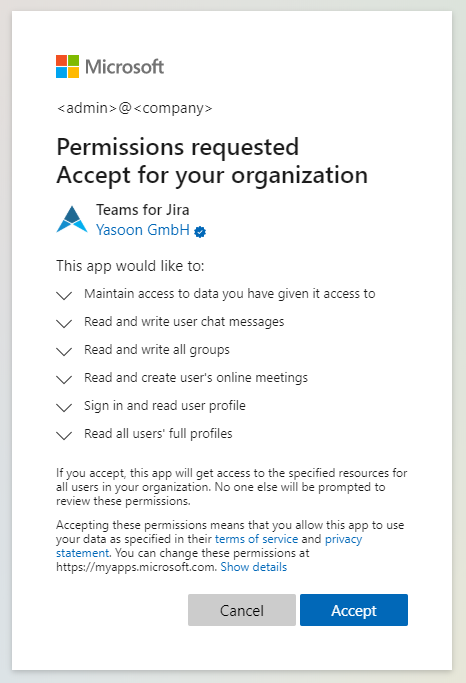 Using our app requires delegated access to Microsoft 365, via the Microsoft Graph API. We use the most common form of delegated authentication flow, the authentication code flow via an Enterprise application. In many cases, access to Microsoft Graph resources is restricted by default. If you can’t login from Jira or Microsoft Teams, your Microsoft 365 or Azure administrator might need to consent to the app for you.