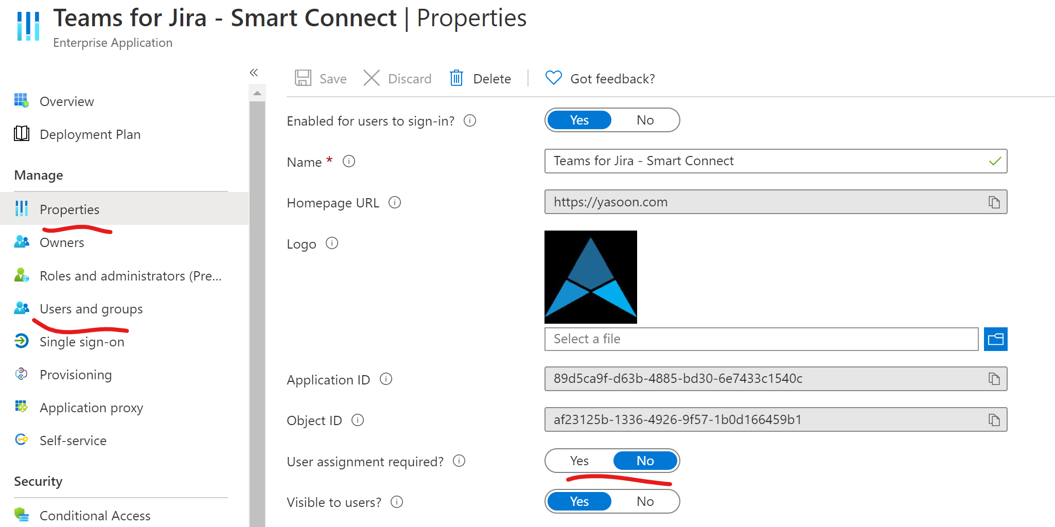 Afterwards, you should be able to find the enterprise app in the UI linked above, where you can restrict the application to certain users or groups, or, using the “Properties” page, allow users to self-approve the app: