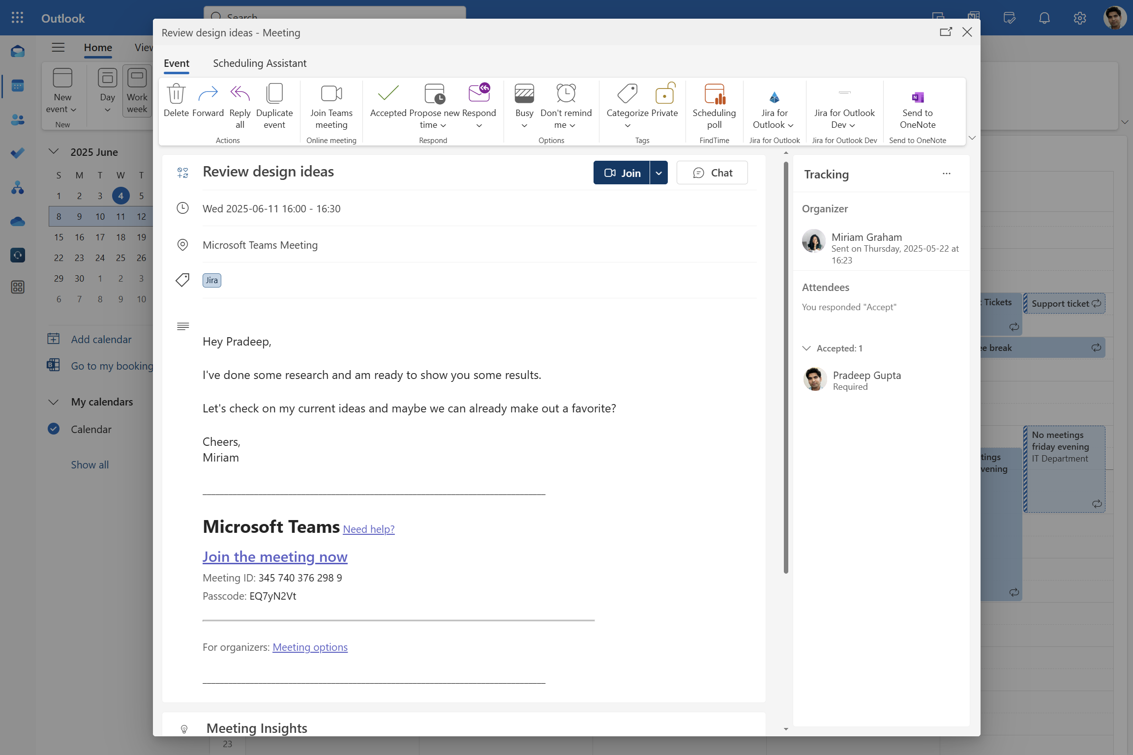 Once the work item is created based on the meeting information, a small “Jira” label appears as a tag in the meeting details, helping you to quickly identify conversations with corresponding work items in Jira. Sure, the work item can now be found in the sidebar in Outlook, as well.