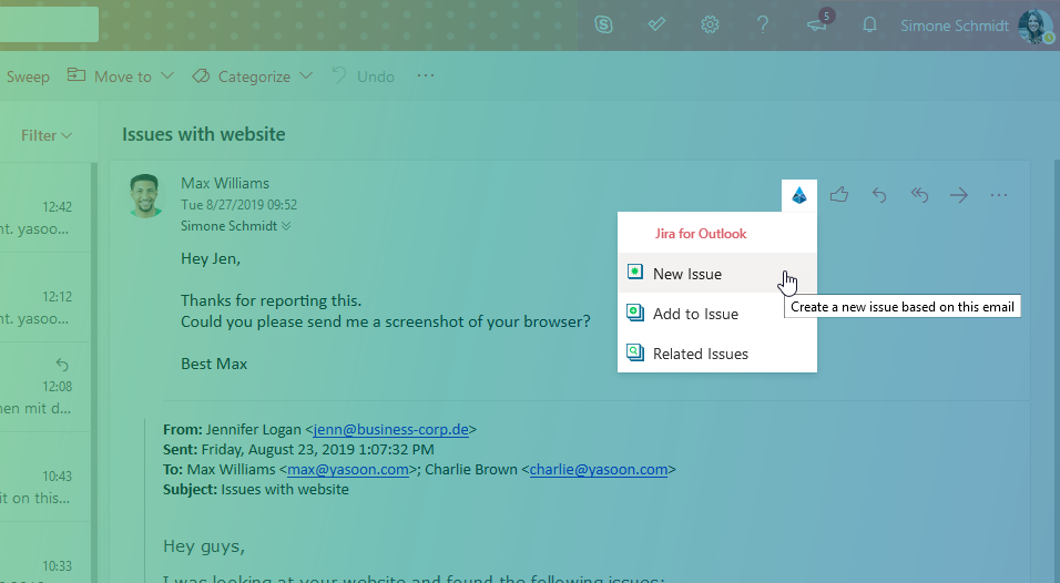 Pretty far down in the drop-down menu, you can find your Jira for Outlook. Here you can choose between the three actions: New Issue, Add to Issue or View Issues.