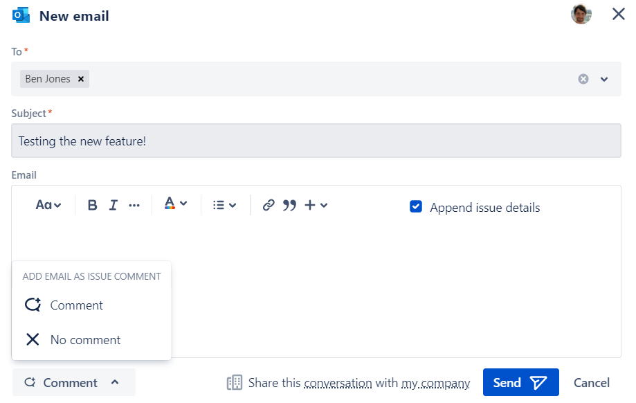 It’s now possible to add the sent email as a comment automatically