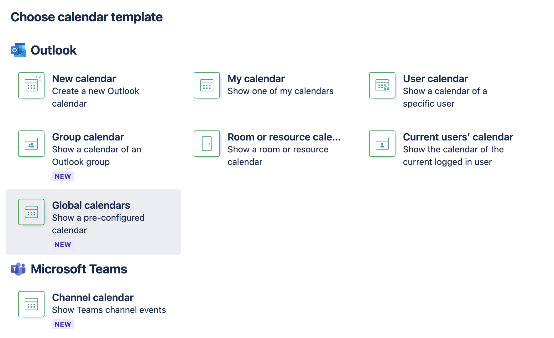 When you have added a shared mailboxes in the admin configuration, a new Template “Global calendars” will appear when editing or embedding a new calendar.
