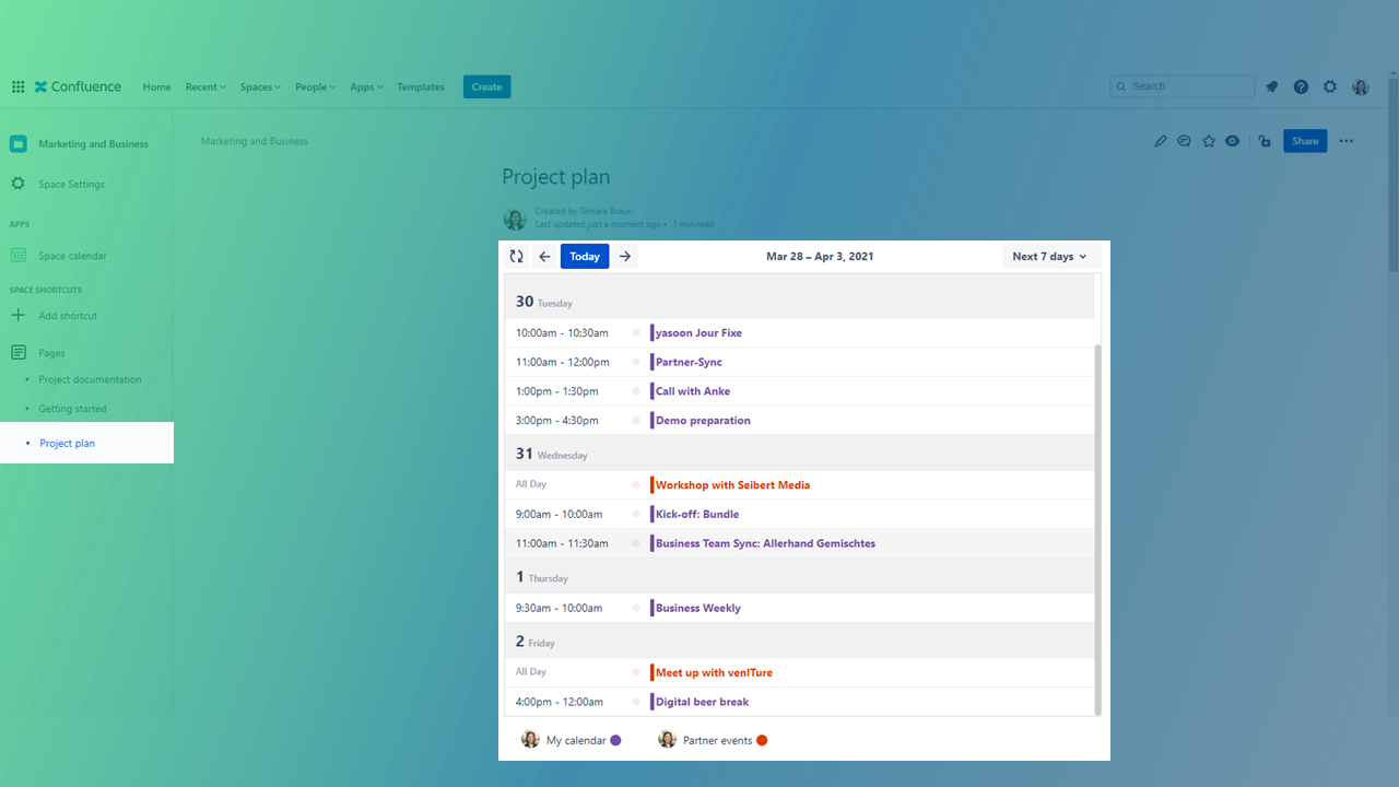 Choose the list view if you want to get an overview of your daily tasks for example. A list view is especially applicable when working on a Confluence page as it needs vertical space. Moreover, you can have your personal dates along with project-related information.
