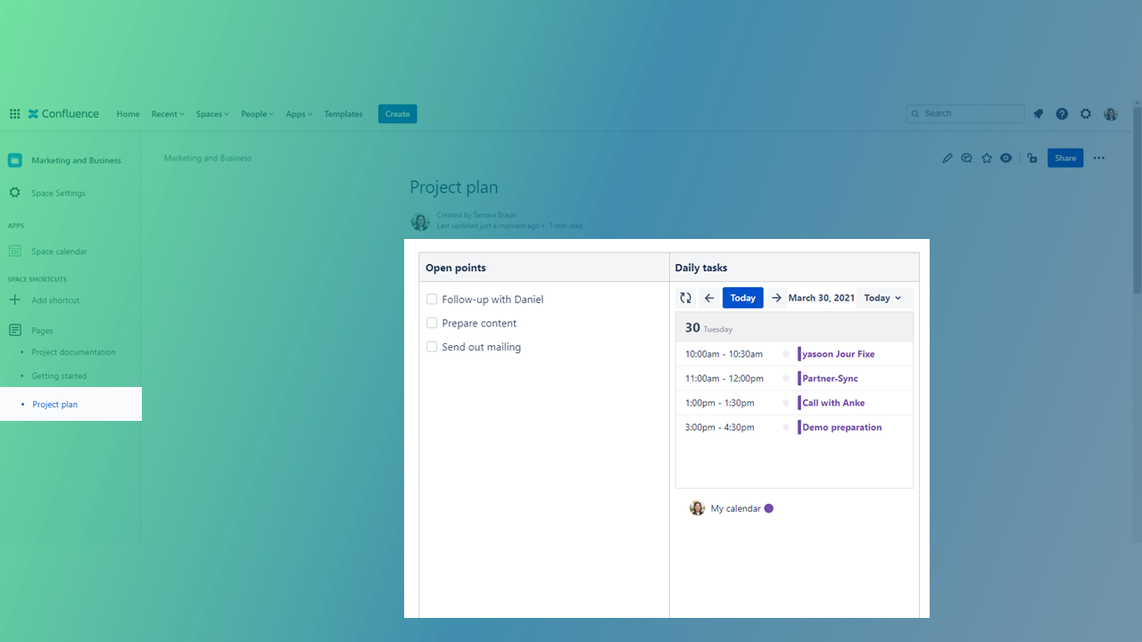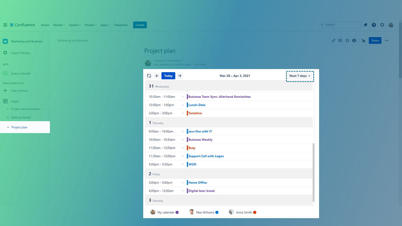 Insert a calendar on space level with a calendar layout to get an overview of upcoming project deadlines along with the availability of your team members.