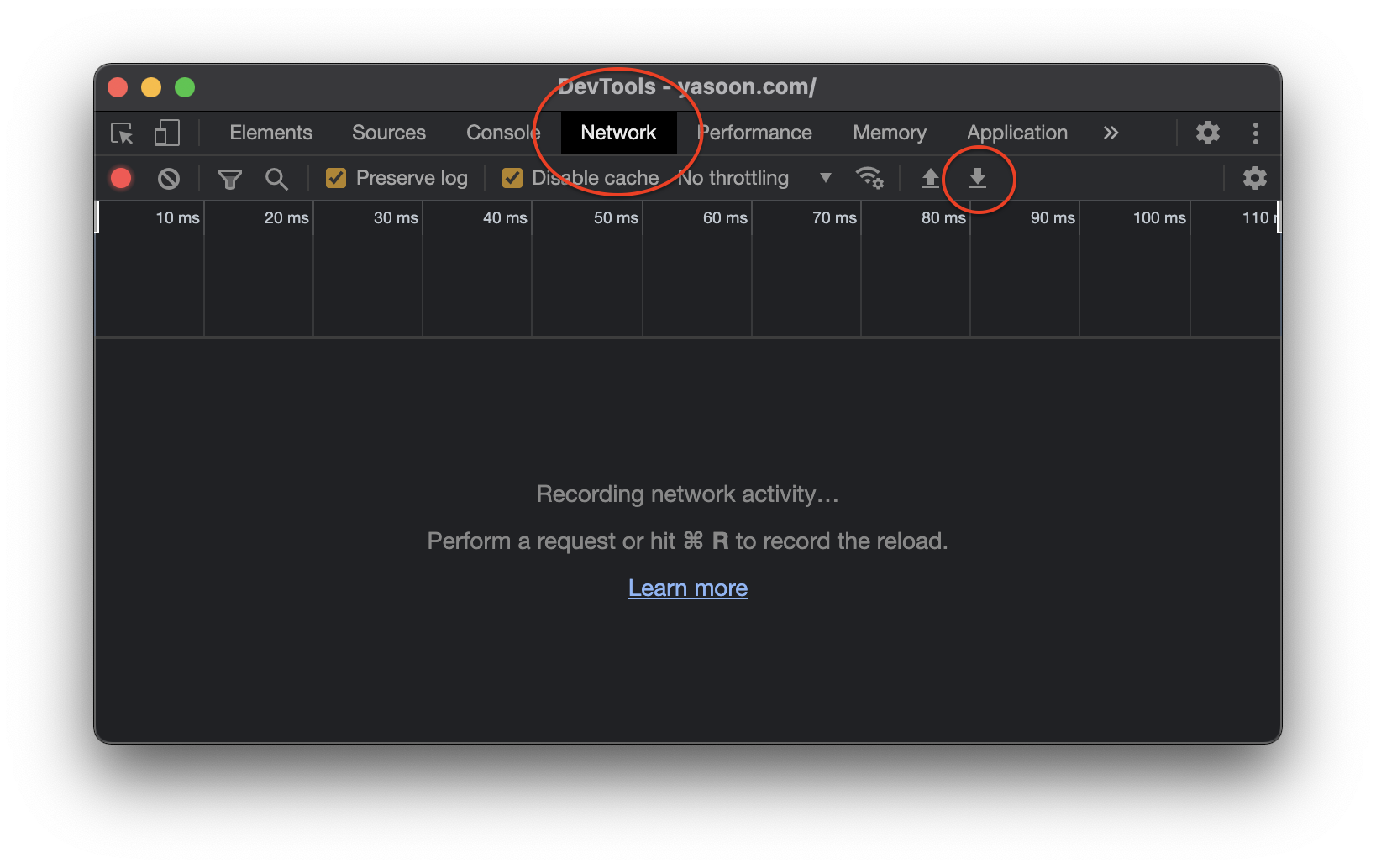 In Developer Tools, navigate to the Network tab and click the export icon. Choose a location and download the .har file.
