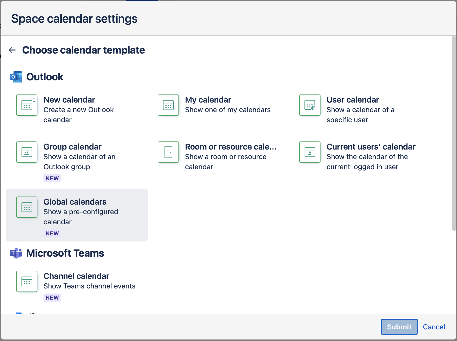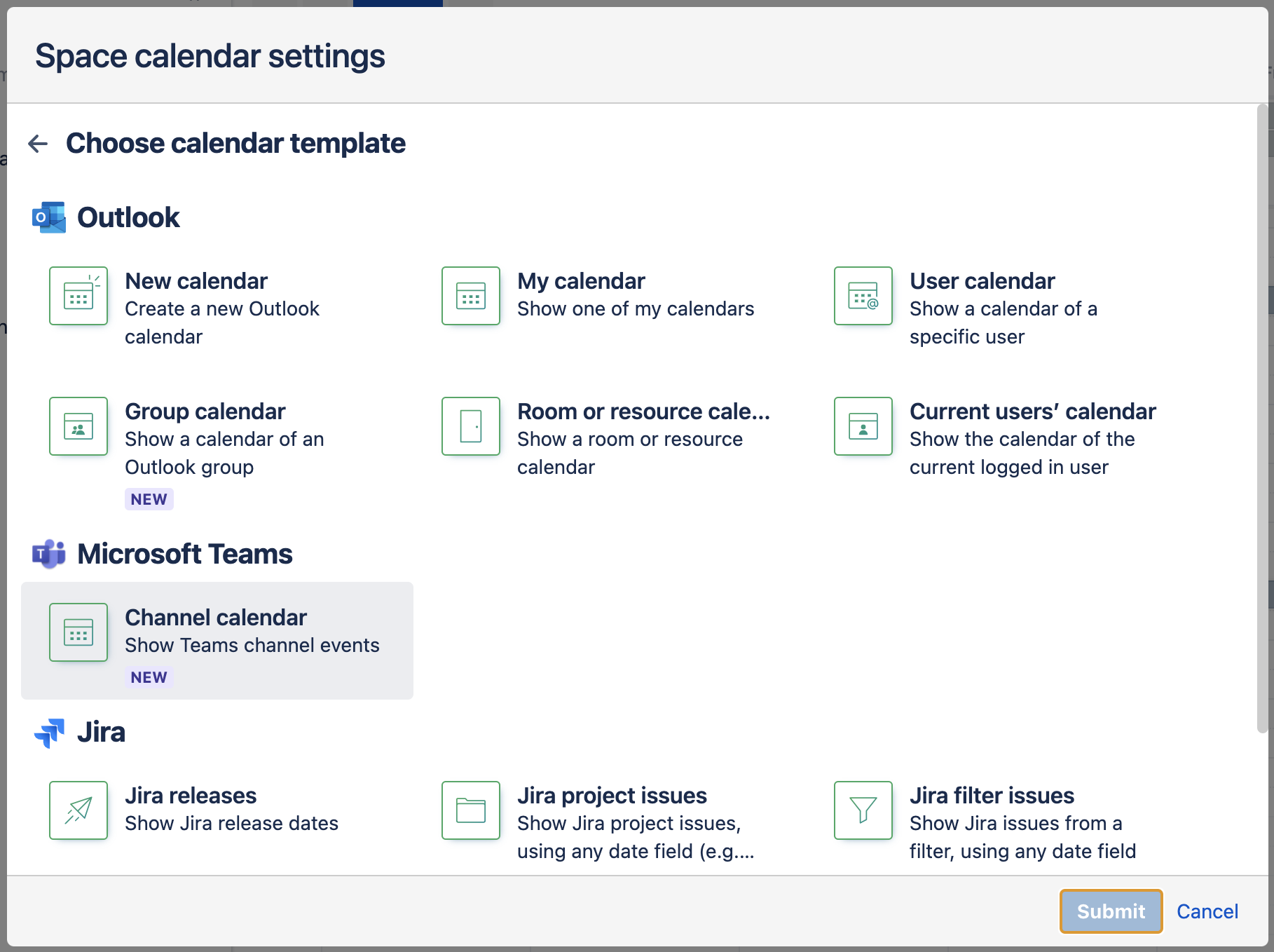 It is now possible to embed Teams channel and group calendars in Confluence. Start adding your first Teams calendar by selecting the new template. Everything you need to get started can be read in our how to article: Enable Microsoft Teams calendars
