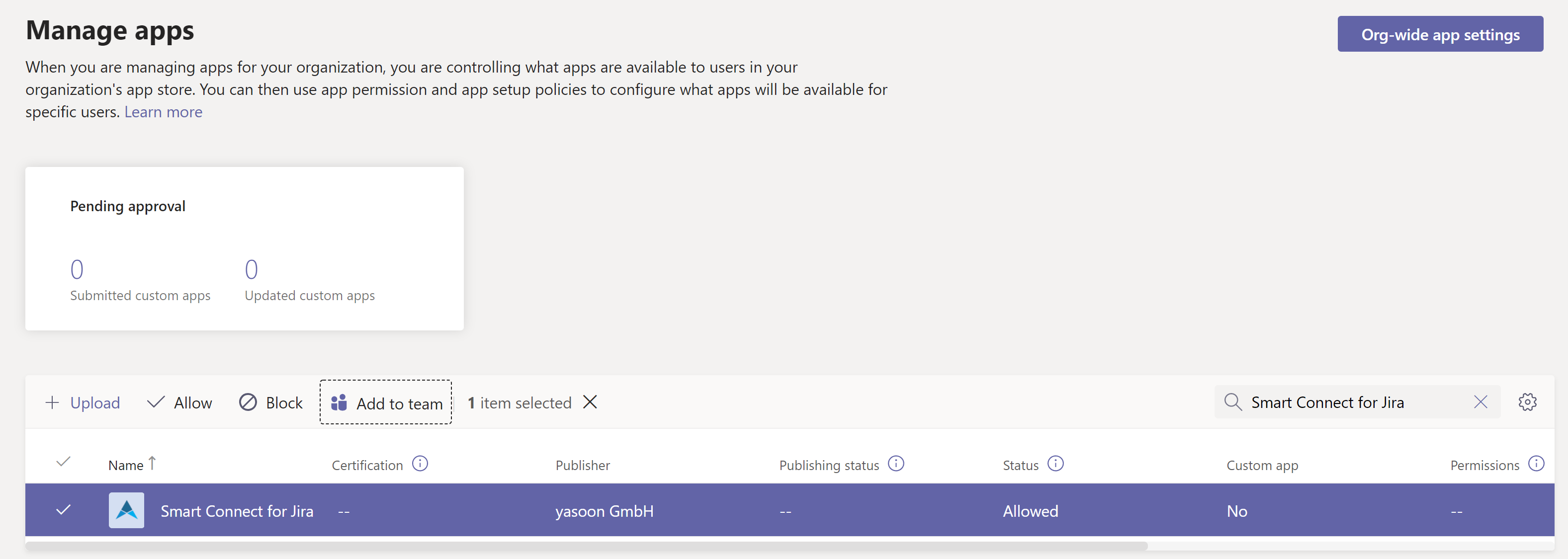 Search for the “Smart Connect for Jira” app, and add it to the requested team. In case the app is not allowed by default, it might also be necessary to allow the app first.