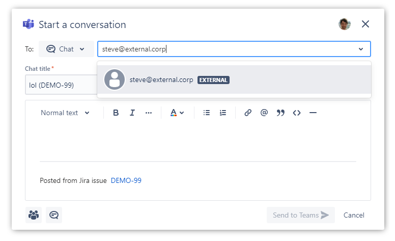 Creating a chat with external users works the same way as with internal users. Just enter the email address of the external contact when creating a chat.