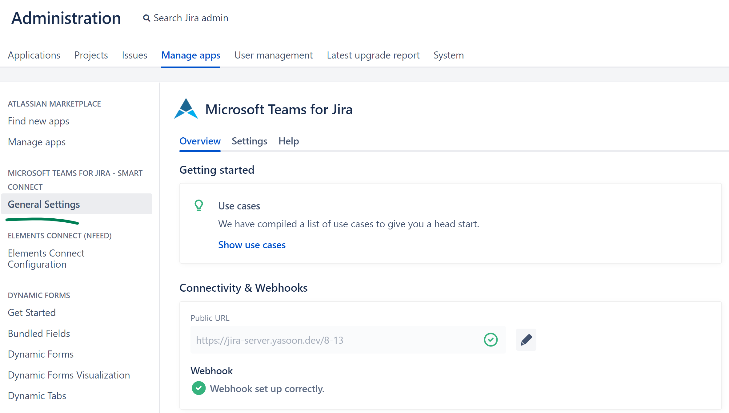 In general, you should not need to configure anything manually if your Jira instance is publicly available. On installation, we’ll try to register the instance with our cloud infrastructure and setup the outgoing webhook. You can check the current status of the registration in the settings. In case your public Jira URL is not the same as the configured Jira base URL, you might need to adjust this here.