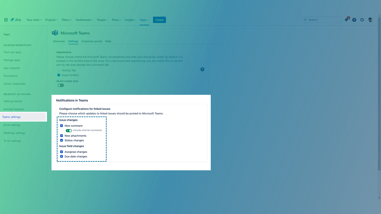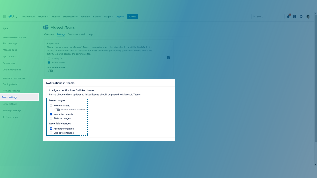 When activating the Teams feature in Microsoft 365 for Jira, you can now globally define when you and your team should be notified about any linked issue changes in Microsoft Teams via our Jira bot.