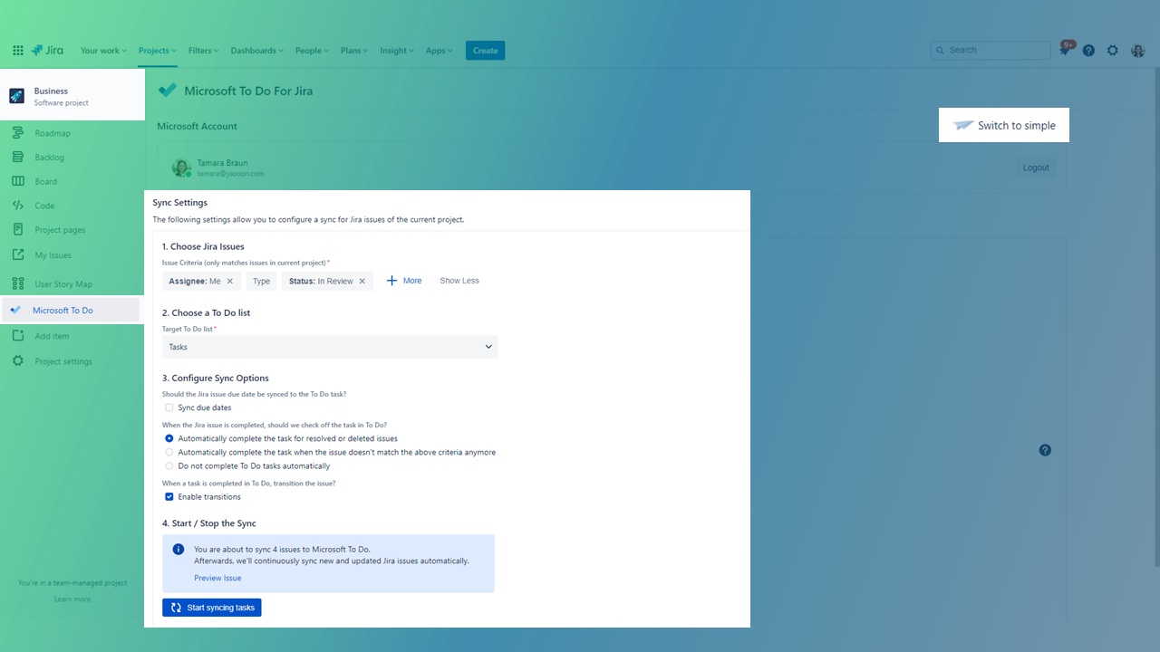In the simple configuration you can set-up the sync of your Jira issues into your Microsoft To Do list in simple steps. There are no detailed configuration options available.