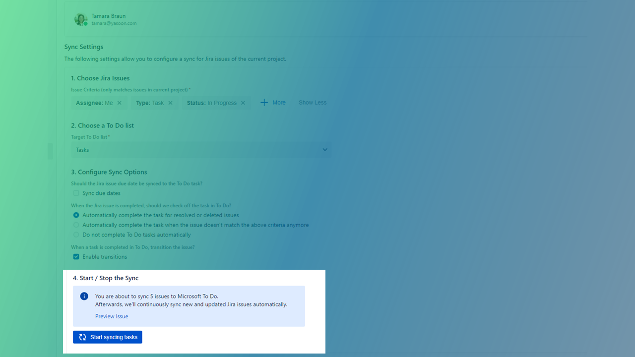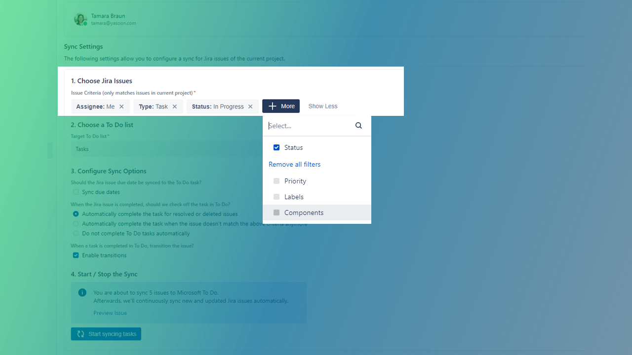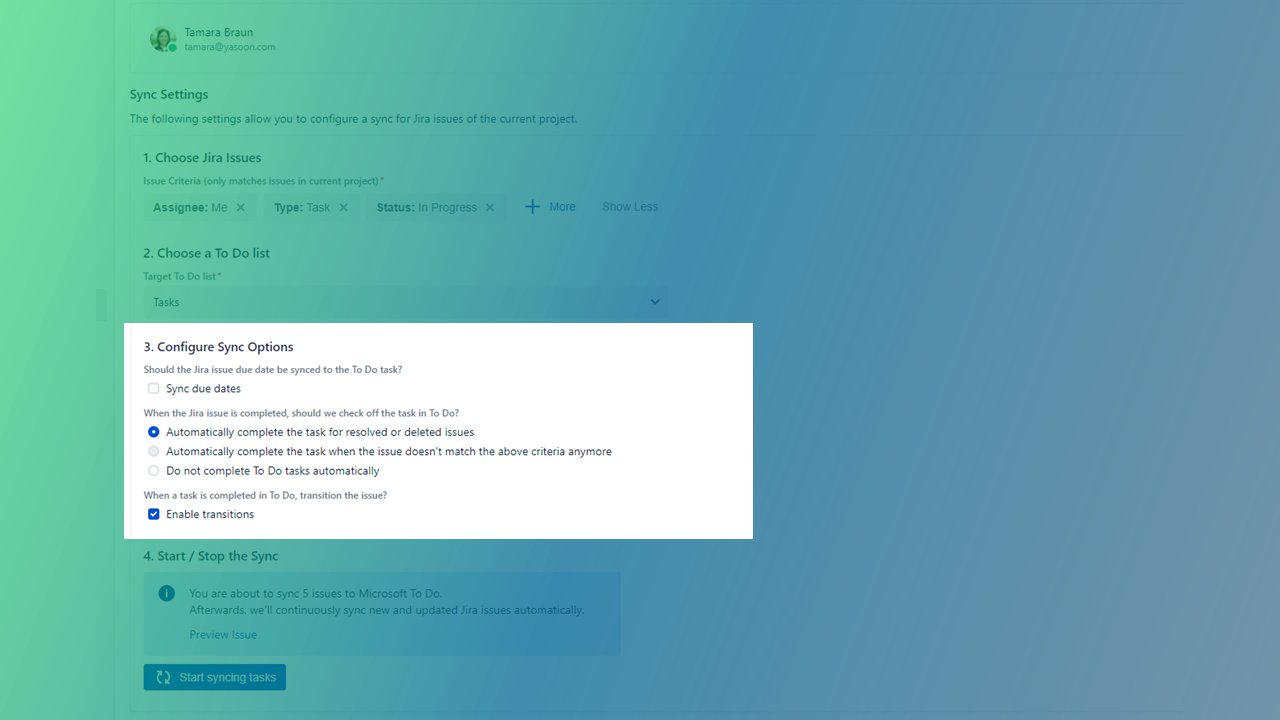 Define your sync options in more detail e.g. take over the due dates of your Jira issues into your To Do list and stay on track on urgent tasks.