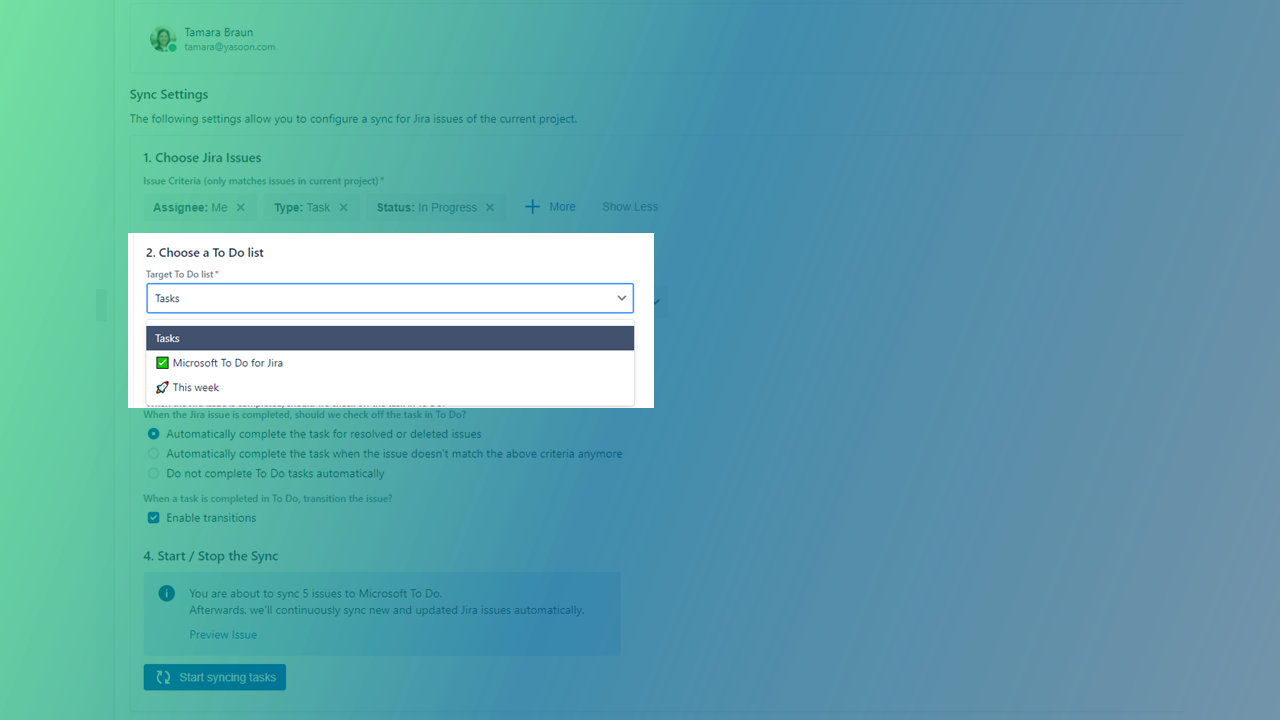 Sure, also define what should happen to the Jira issue in your project, if the task in To Do has been completed. Especially for all those users mainly using To Do for their daily planning, tasks might rather be completed in To Do. Define here, where the respective issue in Jira should be transitioned to (e.g. “done”).