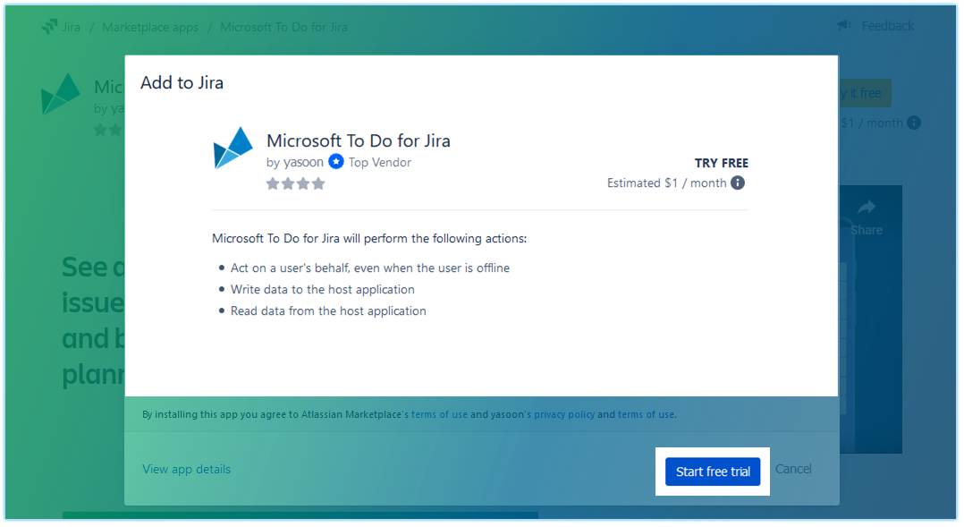 After this click you have confirm your trial on this upcoming window with Start trial. You can find more information about the permissions here.